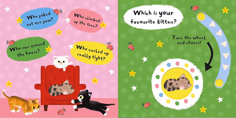 In My Favourite Kitten, older babies and toddlers can have lots of fun opening the peekaboo flaps with the easy-to-grab pull-down flaps and turning the wheel to choose their favourite character. From the cheeky kitten playing hide and seek to the sleepy kitten curled up for a nap, which kitten will your little one pick?